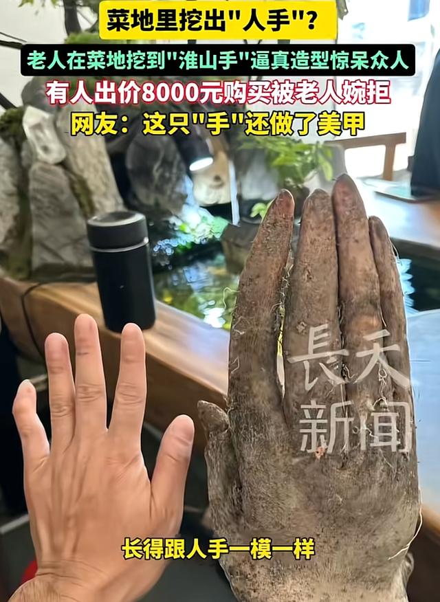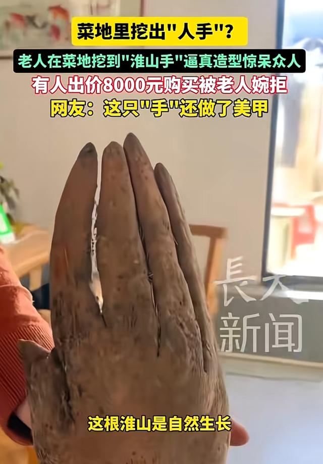 随后刘阿姨的家人也回应了更详细的情况,刘阿姨一共栽种了三十个山药,每个山药都是自然生长,但只有这个山药成了手掌状,其他的都很正常,并且这个山药已经有人出价八千元购买,但被刘阿姨拒绝。