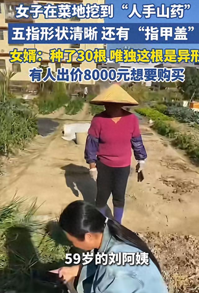 刚开始挖出的山药都很正常,可挖着挖着,刘阿姨突然从菜地里挖出一个人手。